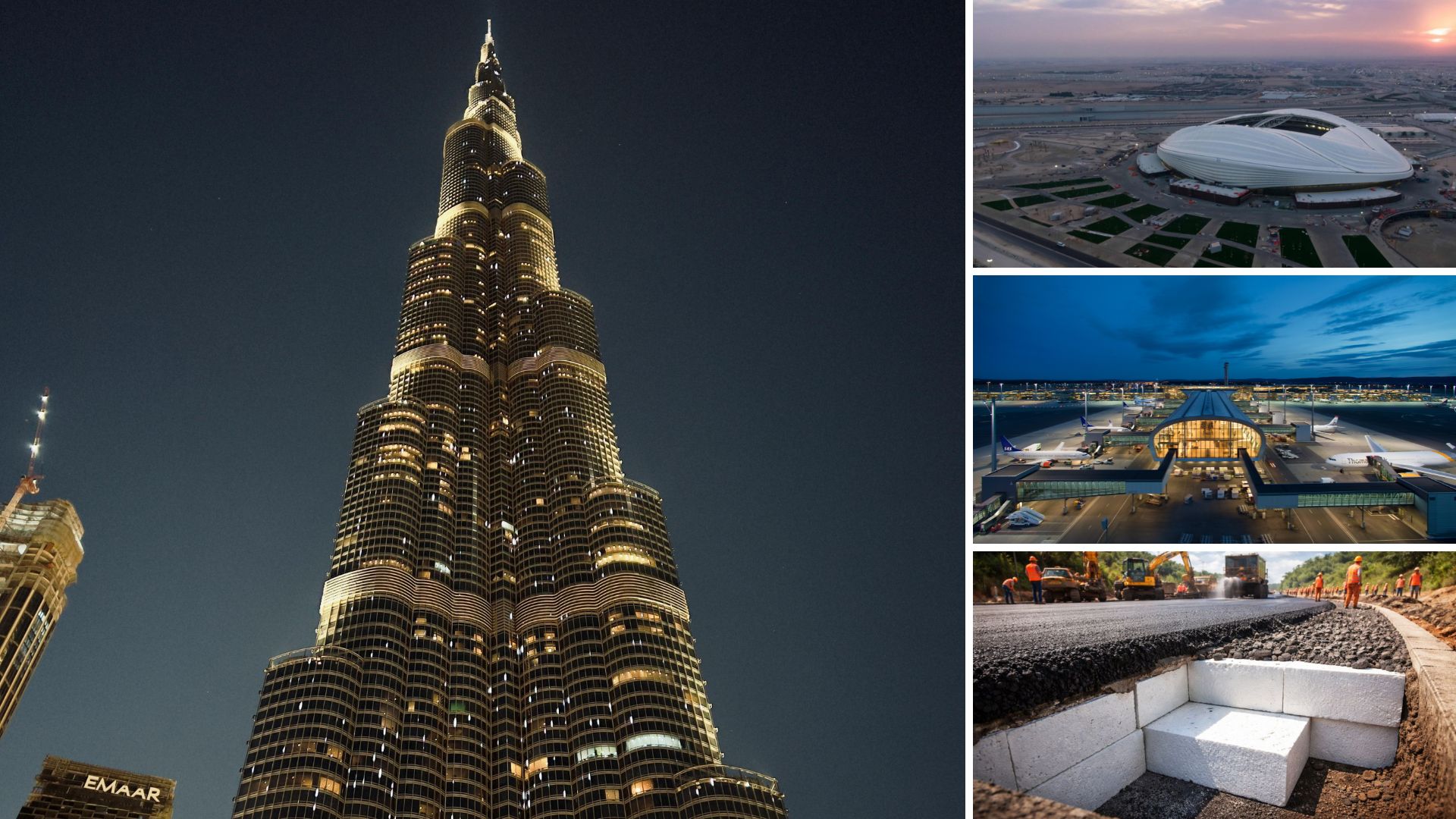 Na ordem: Burj Khalifa; Al Janoub Stadium; Oslo Airport; Eps na estrada.