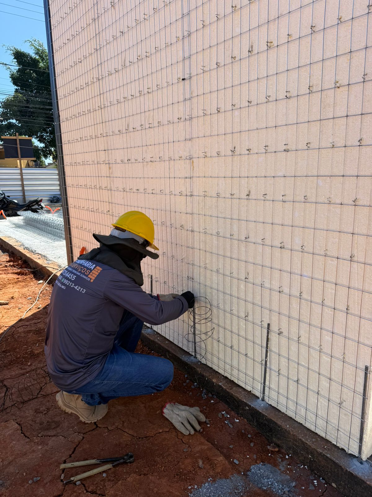 Aplicação em ambos os lados com cimento e agregados, conferindo maior resistência e acabamento ao painel.